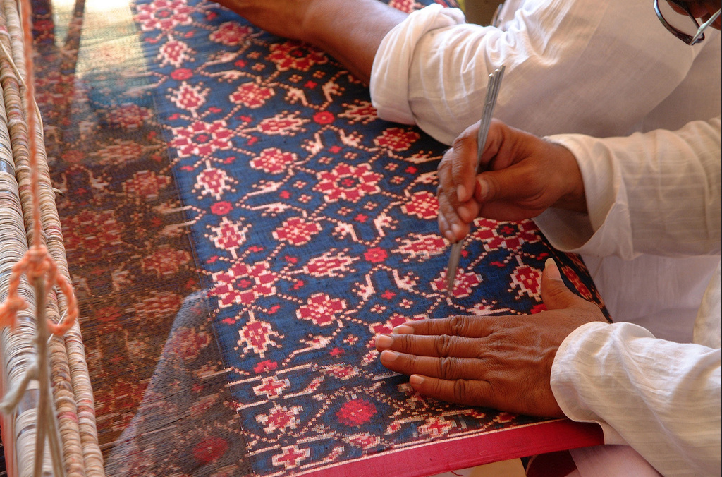 The textiles each have an own individuality. They include exotic and dramatic patterns, a vibrant but delicate colour scheme, special tie-dye techniques, and an opulent look. The region is famous for its silk ikat weaves, which are made on looms employing a challenging technique (bandha) in which wrap and weft threads are first joined and then dyed to create the desired design.